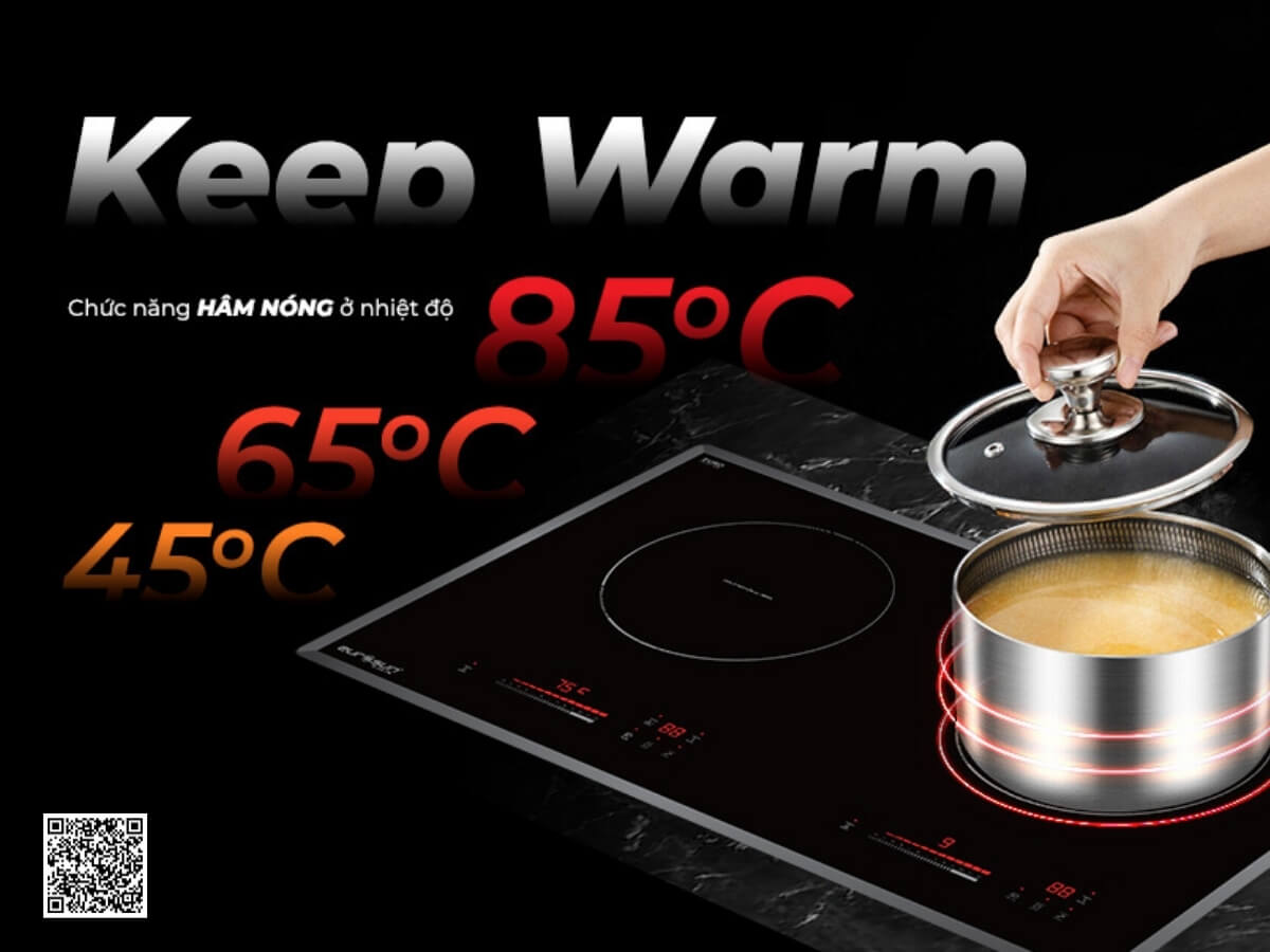 Ngoài ra, bếp còn tích hợp chế độ Warm (giữ ấm ở 65°C – 85°C) và chế độ Frying (chiên rán), giúp món ăn luôn ở nhiệt độ lý tưởng, giữ trọn hương vị tươi ngon mà không lo cháy khét. Tất cả mang lại trải nghiệm nấu ăn chuyên nghiệp và tiện lợi hơn bao giờ hết.