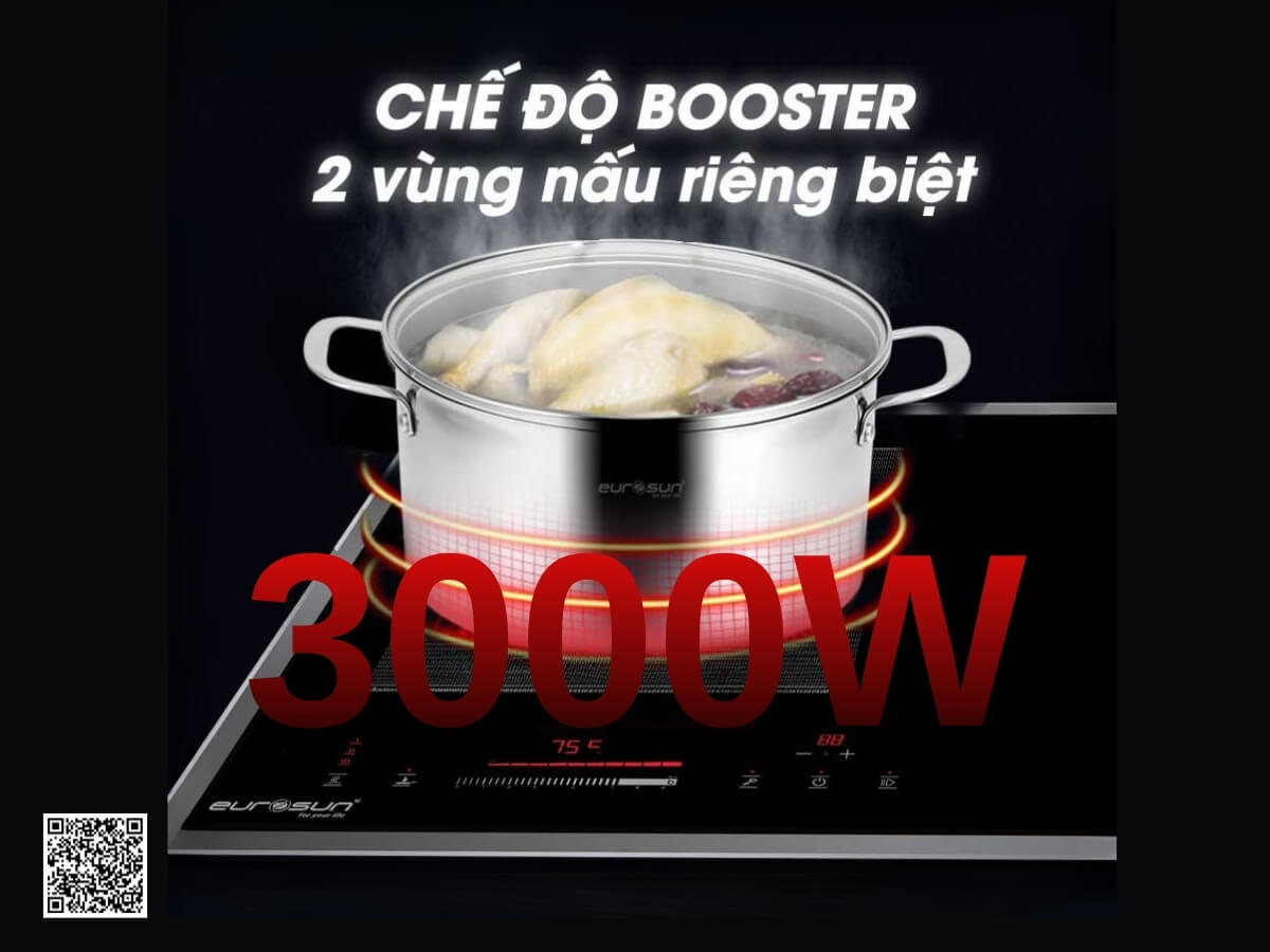 Mỗi vùng nấu của bếp từ Eurosun EU-T769Pro được trang bị với công suất 2100W cùng với chức năng Booster công suất lên đến 3000W, bếp sẽ kích công suất lên mức cao nhất duy trì khoảng 10 phút, nhanh gấp đôi so với bếp từ thông thường. Chức năng này đặc biệt hữu ích khi cần đun sôi nước hoặc nấu món ăn trong thời gian ngắn. Nhờ khả năng truyền nhiệt trực tiếp vào đáy nồi, bếp giúp giảm thất thoát năng lượng, tiết kiệm điện và tối ưu thời gian nấu nướng hàng ngày. Dù hoạt động ở công suất cao, bếp vẫn đảm bảo hiệu suất ổn định và an toàn tuyệt đối.