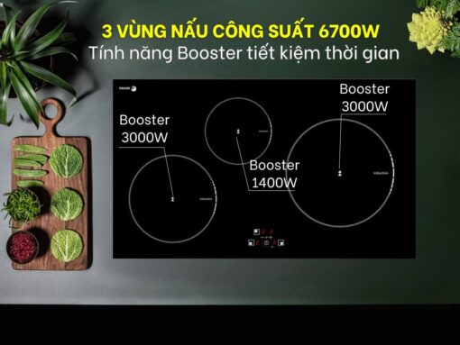 3 vùng nấu công suất 6700W, có chức năng Booster nấu nhanh
