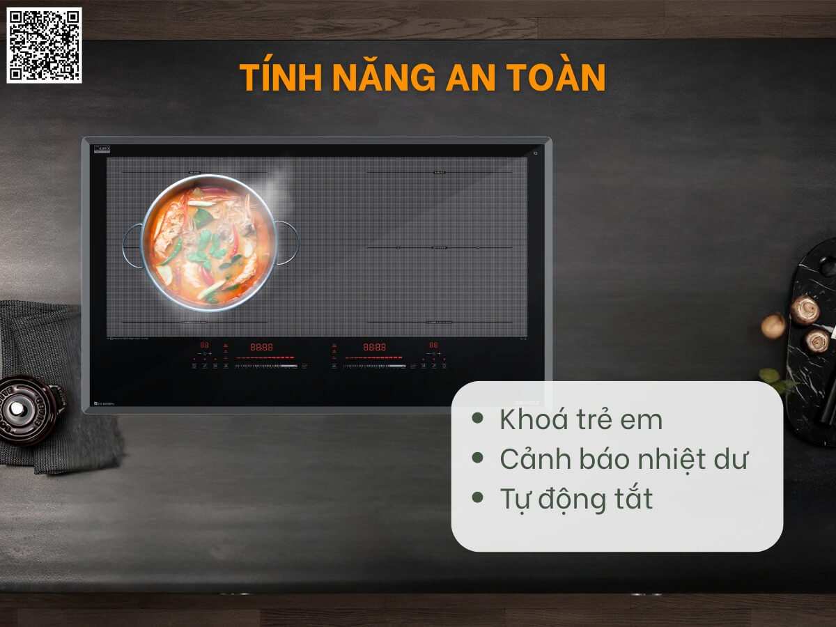 Đặc biệt, mỗi vùng nấu được trang bị chức năng Booster gia nhiệt cực đại. Khi kích hoạt, bếp sẽ nâng mức công suất lên 3000W trong thời gian ngắn, giúp đun sôi nước và nấu chín thực phẩm nhanh gấp 2-3 lần so với bếp truyền thống.