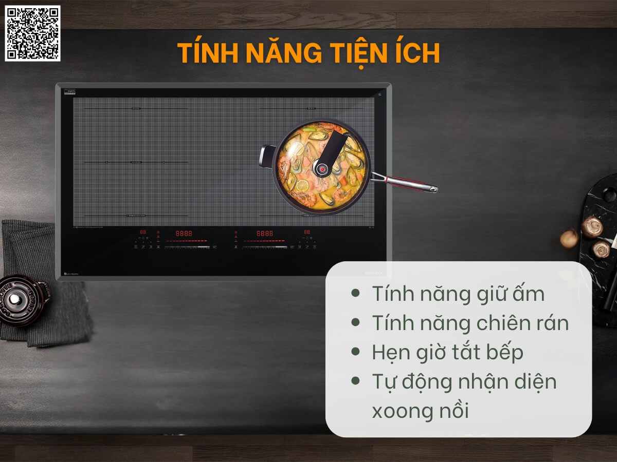 Đặc biệt, mỗi vùng nấu được trang bị chức năng Booster gia nhiệt cực đại. Khi kích hoạt, bếp sẽ nâng mức công suất lên 3000W, giúp đun sôi nước và nấu chín thực phẩm nhanh gấp 2 lần so với bếp truyền thống.
