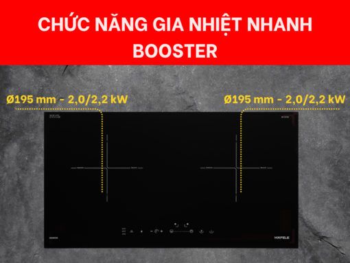 Tính năng gia nhiệt nhanh Booster được trang bị trên mỗi vùng nấu của bếp từ Hafele HC-I2712A, giúp mỗi vùng nấu có công suất tối đa 2000W và đạt 2200W khi sử dụng Booster. Tính năng này rất hữu ích khi cần nấu nướng nhanh. lý tưởng cho các món áp chảo hay đun sôi nước.