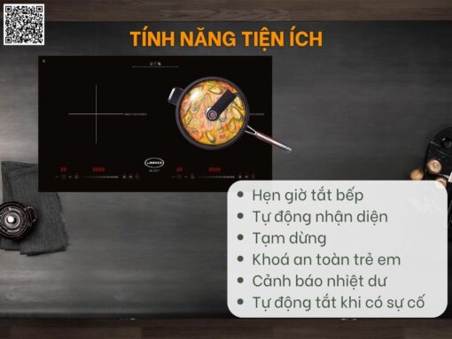 Bếp từ Jiko JK 570 T thiết kế lắp âm với mặt kính Kanger sang trọng, bền bỉ. Bếp có 2 vùng nấu điều khiển độc lập bằng bảng cảm ứng trượt, tổng công suất 4000W giúp nấu nướng nhanh chóng, tiện lợi. Bếp còn có nhiều tính năng công nghệ hiện đại đem đến trải nghiệm nấu nướng tuyệt vời cho người dùng: tạm dừng, hẹn giờ, tự nhận diện xoong nồi, cảnh báo nhiệt dư, khoá trẻ em, tự động tắt bếp khi có sự cố…