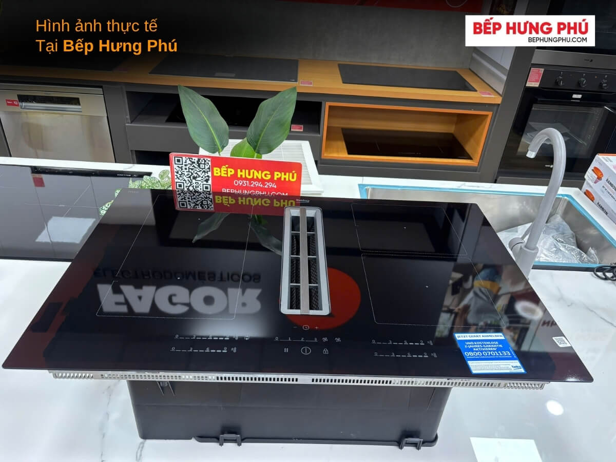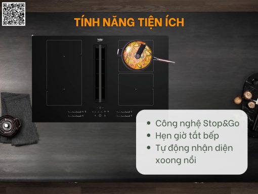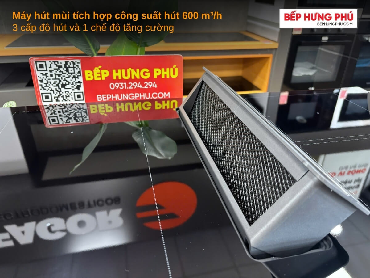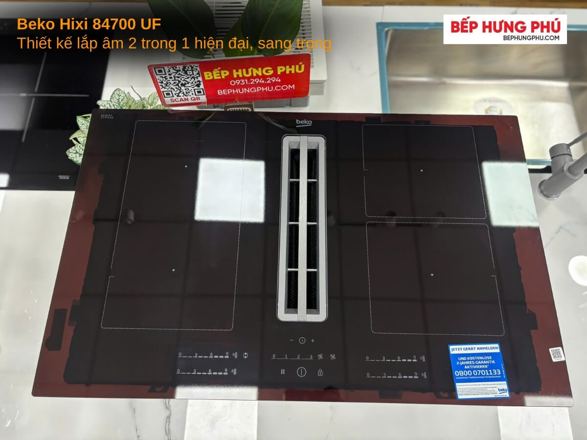 Điểm nổi bật của Bếp từ Beko HIXI 84700 UF là máy hút mùi tích hợp âm ngay mặt bếp. Với công suất hút 600 m³/h, 3 cấp độ hút và 1 chế độ tăng cường, bếp đảm bảo hút sạch khói và mùi thức ăn. Hệ thống có thể lắp đặt tuần hoàn (với bộ lọc than hoạt tính) hoặc thông gió (thông ra ngoài). Máy cũng trang bị bộ lọc dầu mỡ và bộ gom chất lỏng chống tràn, giúp vệ sinh dễ dàng.