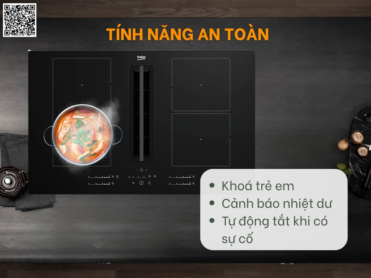 Bếp từ kết hợp hút mùi Beko Hixi 84700 UF có hệ thống cảm biến hiện đại, có thể tự động ngắt khi phát hiện các sự cố như bếp bị quá nhiệt, đảm bảo an toàn cho thiết bị và người dùng.