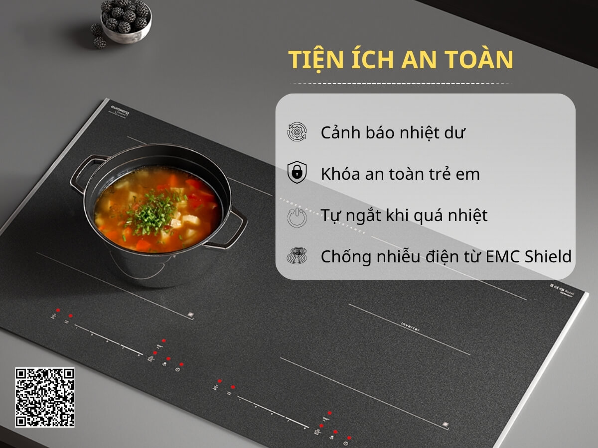 Hệ thống chống nhiễu điện từ EMC Shield giúp bếp hoạt động ổn định, không ảnh hưởng đến các thiết bị điện khác trong gia đình. Ngoài ra, chức năng nhận diện nồi tự động (Pot Detect) giúp bếp nhận biết chính xác vùng nấu, hạn chế thất thoát nhiệt, đảm bảo an toàn và hiệu suất tối ưu.