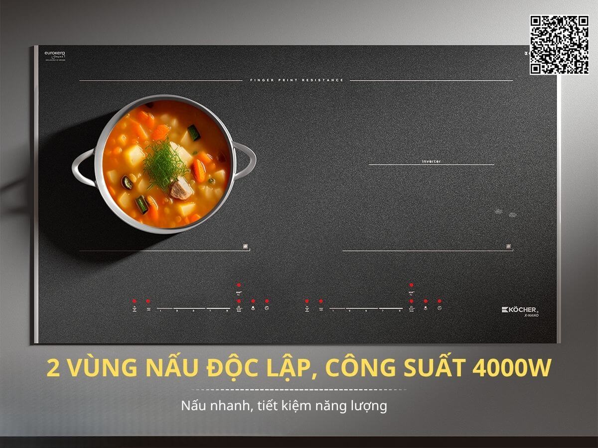 2 vùng nấu tiện lợi, tổng công suất mạnh mẽ 4000W