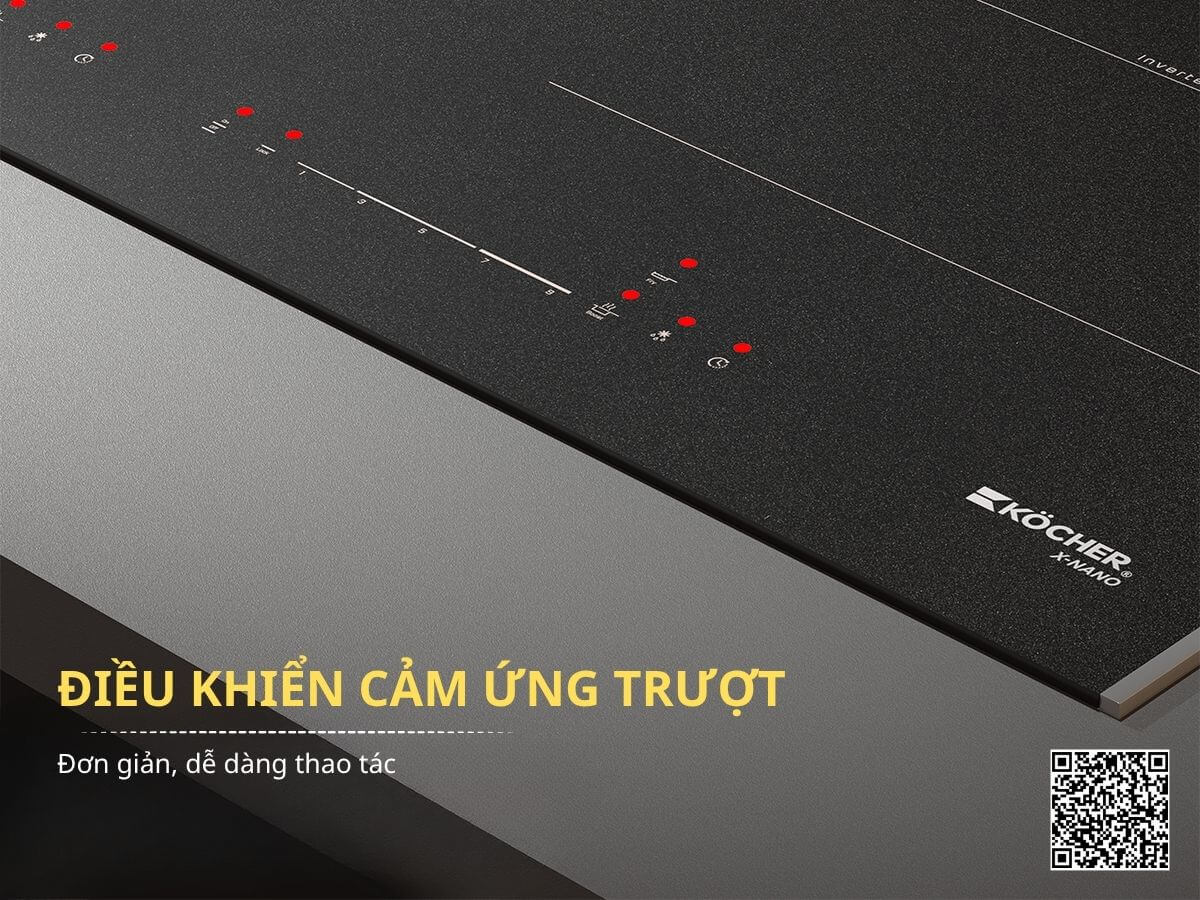Bếp từ Kocher X-NANO 6 được trang bị bảng điều khiển cảm ứng dạng trượt (Slide Control) siêu nhạy, giúp thao tác điều chỉnh công suất, nhiệt độ trở nên trực quan và chính xác chỉ với một lần chạm nhẹ.
