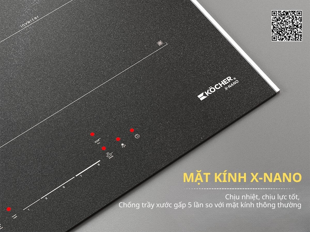 Điểm nhấn đặc biệt của bếp từ Kocher X-NANO 6 chính là mặt kính X-NANO độc quyền, ứng dụng công nghệ Pháp tiên tiến. Loại kính này có khả năng chống trầy xước gấp 5 lần so với mặt kính thông thường, đồng thời chịu sốc nhiệt và chịu va đập cực tốt.