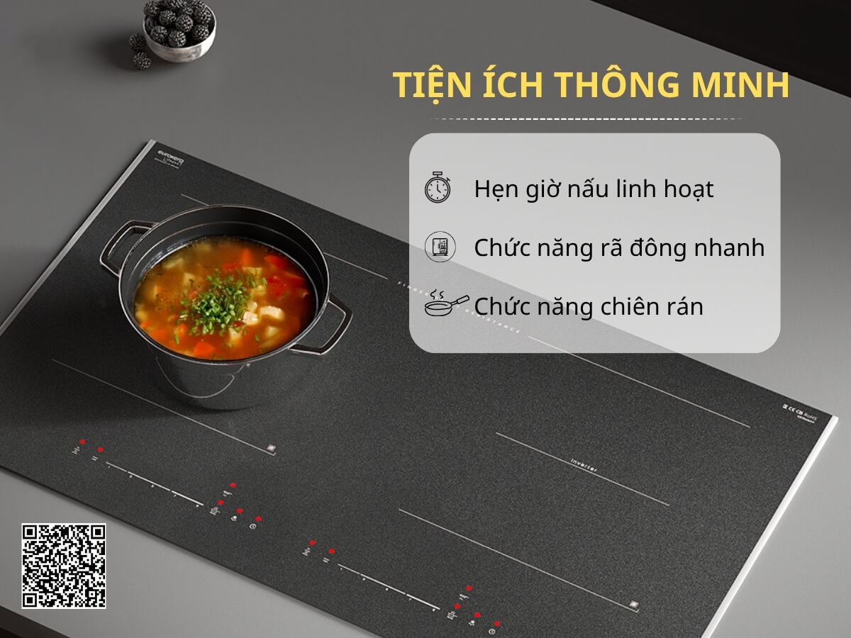 Mỗi vùng nấu được thiết kế bảng điều khiển riêng biệt, giúp người dùng dễ dàng thao tác mà không bị nhầm lẫn. Hệ thống điều khiển thông minh còn hỗ trợ nhiều chế độ nấu như chiên (Fry), rã đông nhanh (Defrozen), hẹn giờ tự động, mang đến trải nghiệm nấu nướng chuyên nghiệp và tiện lợi.