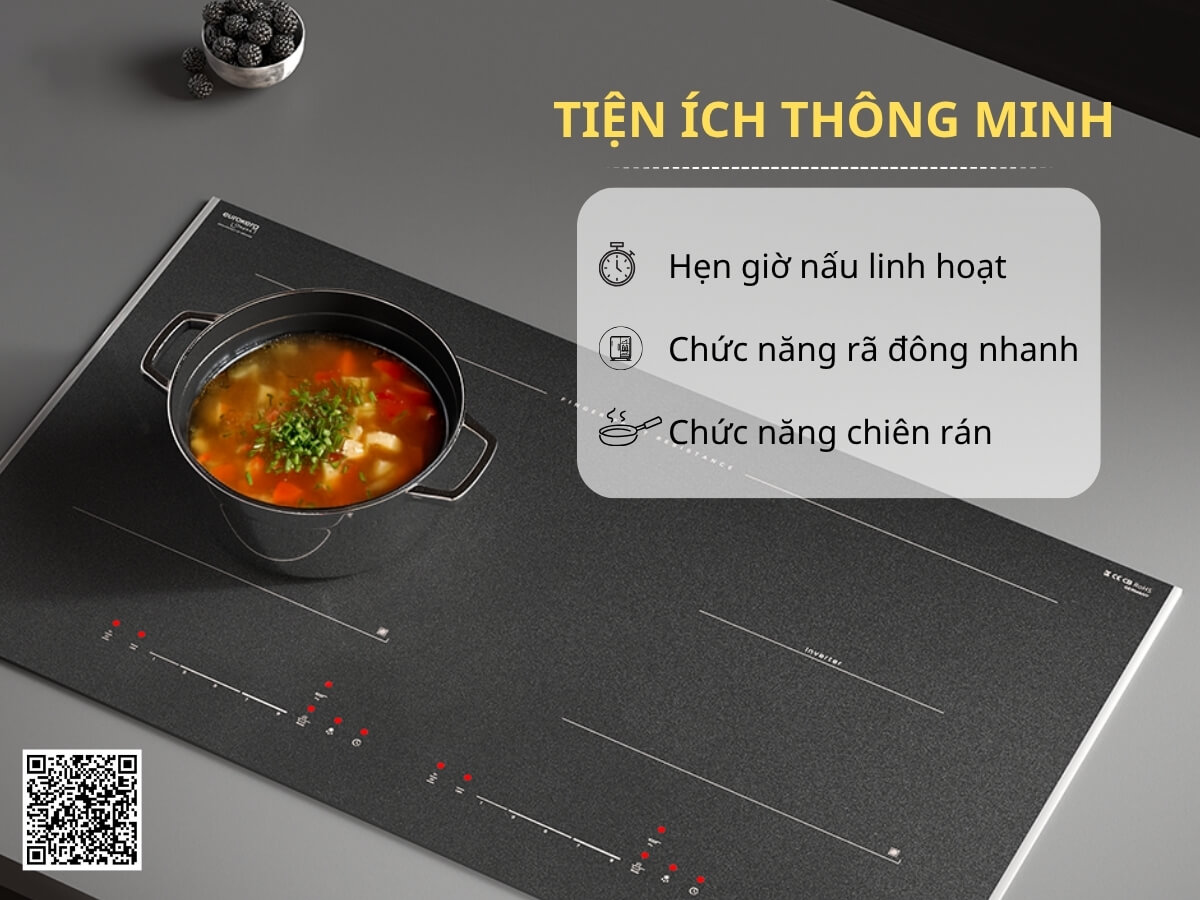 Mỗi vùng nấu được thiết kế bảng điều khiển riêng biệt, giúp người dùng dễ dàng thao tác mà không bị nhầm lẫn. Hệ thống điều khiển thông minh còn hỗ trợ nhiều chế độ nấu như chiên (Fry), rã đông nhanh (Defrozen), hẹn giờ tự động, mang đến trải nghiệm nấu nướng chuyên nghiệp và tiện lợi.