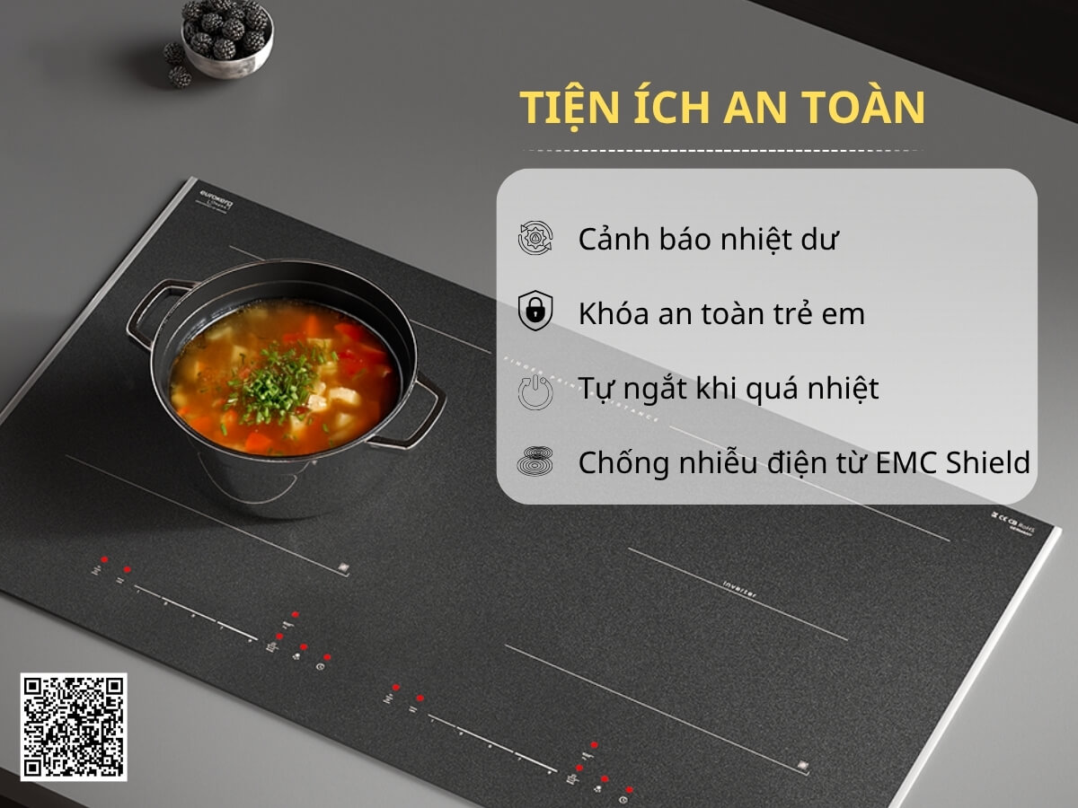 Hệ thống chống nhiễu điện từ EMC Shield giúp bếp hoạt động ổn định, không ảnh hưởng đến các thiết bị điện khác trong gia đình. Ngoài ra, chức năng nhận diện nồi tự động (Pot Detect) giúp bếp nhận biết chính xác vùng nấu, hạn chế thất thoát nhiệt, đảm bảo an toàn và hiệu suất tối ưu.