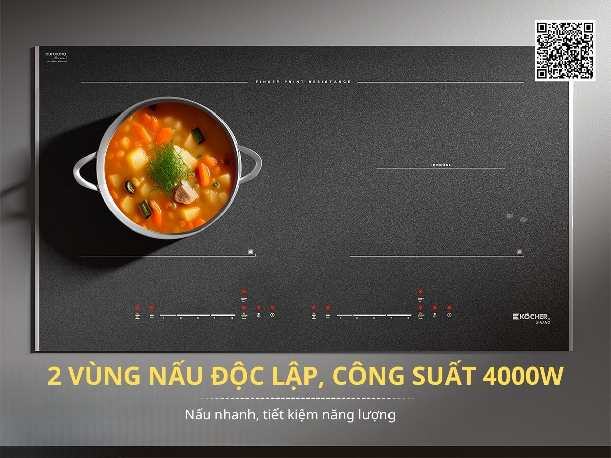 2 vùng nấu tiện lợi, tổng công suất mạnh mẽ 4000W