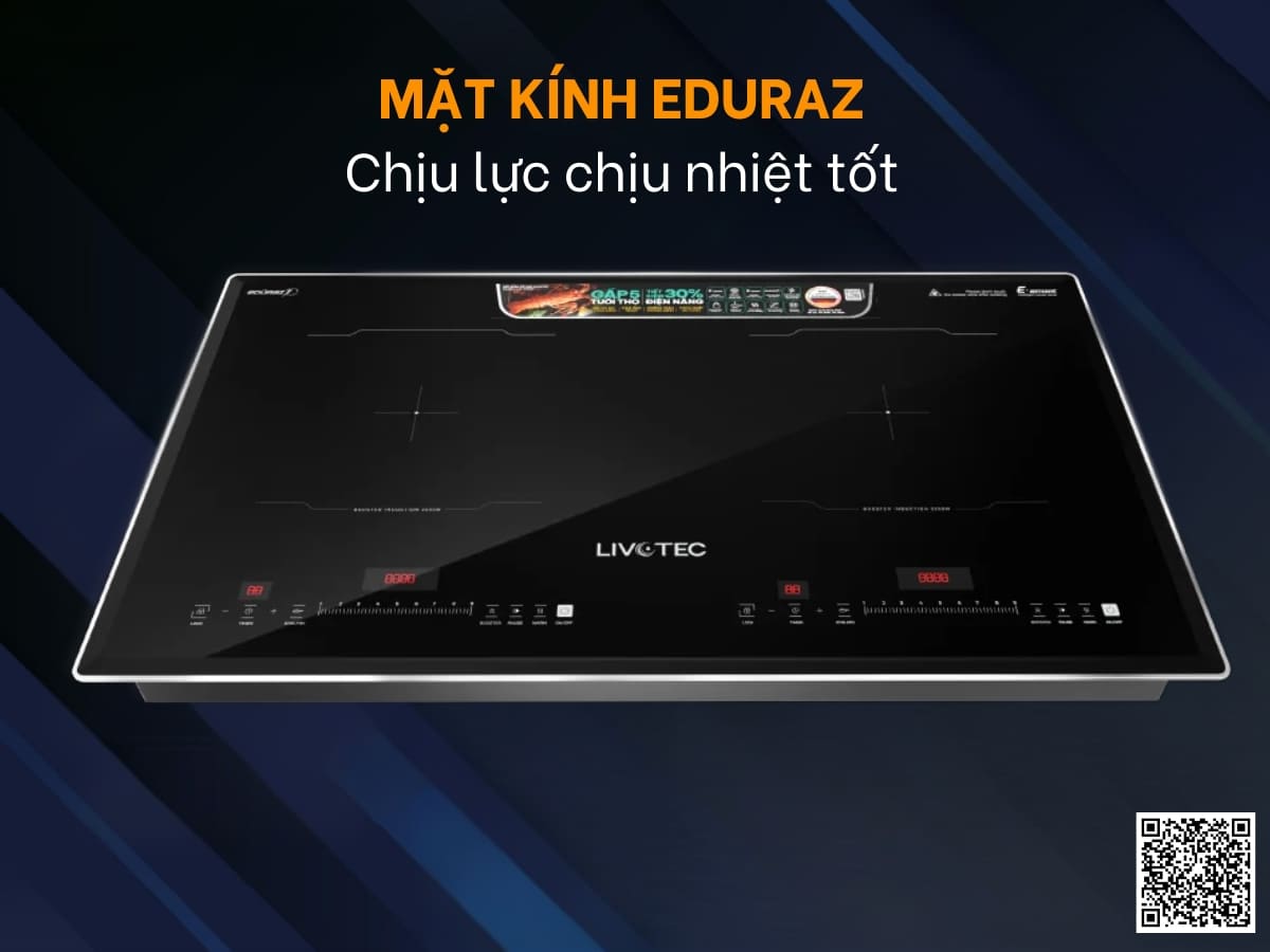 Bếp từ Livotec LID-990M sử dụng mặt kính Eduraz cao cấp, chất liệu bền bỉ và đẳng cấp. Mặt kính nổi tiếng với khả năng chịu lực và chịu nhiệt tới 800 độ C, bền gấp 1.5 lần so với kính thông thường, đảm bảo độ bền vượt trội. Bề mặt kính có khả năng chống trầy xước tốt, bạn có thể thoải mái sử dụng các loại xoong nồi nặng. Bề mặt kính nhẵn mịn cũng giúp việc vệ sinh, lau chùi sau khi nấu trở nên dễ dàng và nhanh chóng.