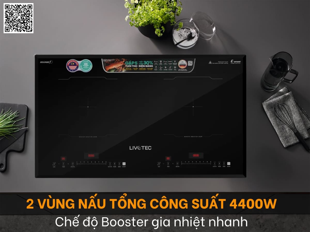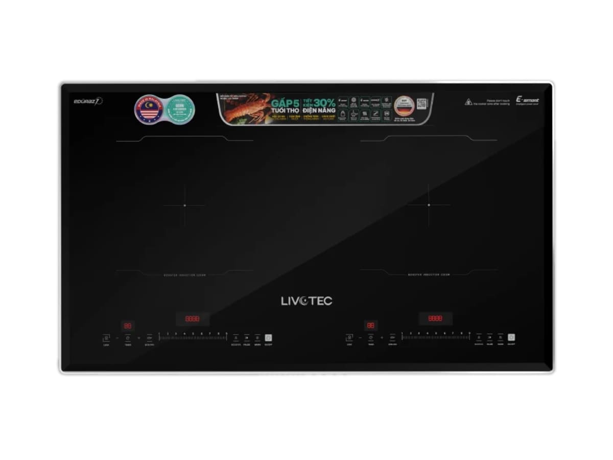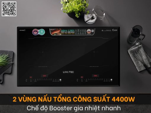 Bếp từ Livotec LID-990M thiết kế 2 vùng nấu từ riêng biệt, được trang bị mâm từ E-smart đường kính lớn với tổng công suất mạnh mẽ lên đến 4400W (Mỗi vùng 2200W), cho phép nấu cùng lúc 2 món, tiết kiệm thời gian tối đa. Bếp sử dụng mâm từ 100% đồng giúp nâng cao tuổi thọ sản phẩm. Đặc biệt, mỗi vùng nấu được trang bị chức năng Booster gia nhiệt cực đại. Khi kích hoạt, bếp sẽ nâng mức công suất lên tối đa trong thời gian ngắn, giúp đun sôi nước và nấu chín thực phẩm nhanh gấp 2-3 lần so với bếp truyền thống.
