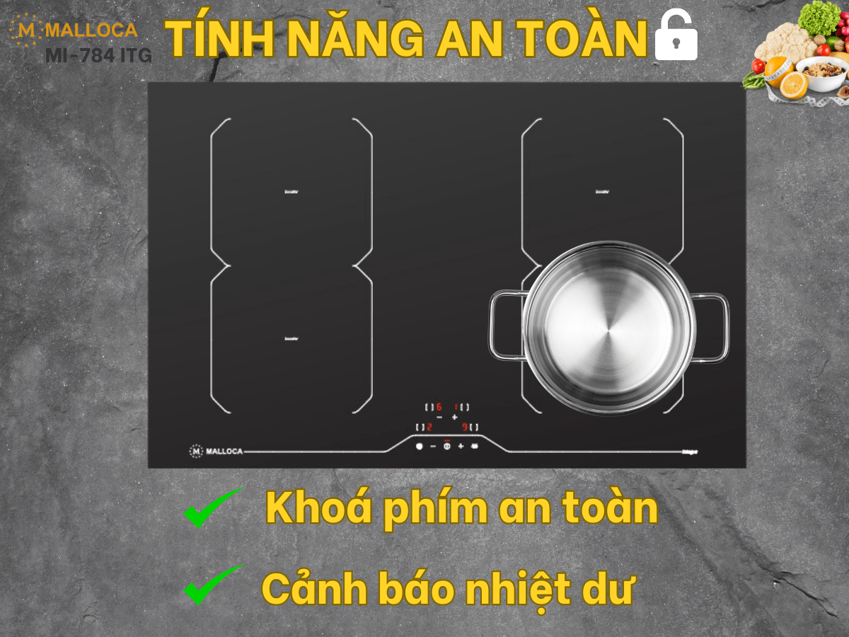 Bếp từ Mallcoca MI-784 ITG sẽ vô hiệu hóa toàn bộ bàn phím khi bạn kích hoạt tính năng này, và các chương trình nấu thì vẫn hoạt động bình thường. Tính năng này giúp ngăn trẻ em vô tình đụng vào bảng điều khiển và làm thay đổi các chương trình nấu bạn đã cài đặt trước đó và gây ra các sự cố nguy hiểm.