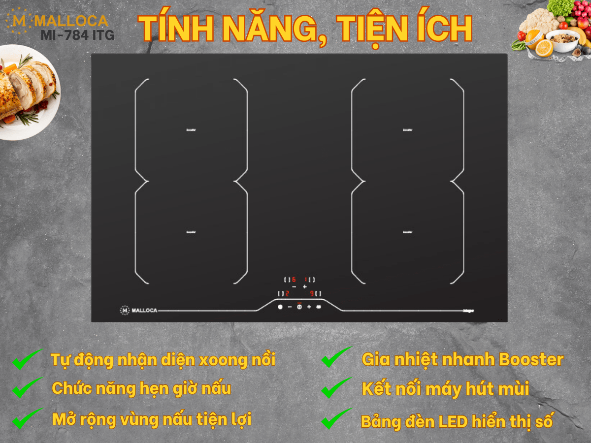 Bếp Từ Malloca MI-784 ITG mang đến trải nghiệm nấu ăn tuyệt vời hơn bao giờ hết. Sản phẩm là sự kết hợp giữa thiết kế sang trọng và công nghệ hiện đại mang nhiều tính ứng dụng cao cho người sử dụng. Nếu bạn đang cần tìm một bếp từ có thể mở rộng vùng nấu tích hợp máy hút mùi thì đây là sản phẩm rất đáng có mặt trong căn bếp của bạn. Sản phẩm tiên tiến đến từ thương hiệu Malloca và được nhập khẩu trực tiếp Ý.