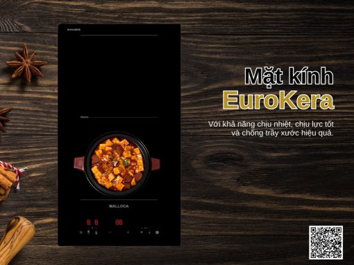 Bề mặt bếp sử dụng kính EuroKera, loại kính cao cấp, nổi bật với khả năng chịu nhiệt, chịu lực tốt và chống trầy xước hiệu quả. Bề mặt kính sáng bóng, dễ vệ sinh, duy trì vẻ đẹp sang trọng lâu dài. EuroKera còn giúp truyền nhiệt tập trung vào nồi nấu, trong khi xung quanh mặt bếp vẫn mát hơn, giảm nguy cơ bỏng khi chạm tay.
