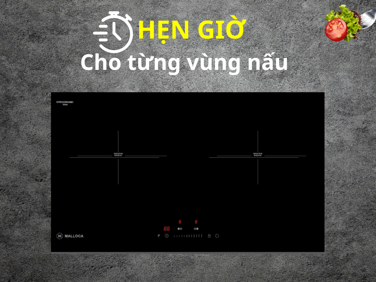 Tính năng hẹn giờ giúp bạn linh hoạt trong việc quản lý thời gian nấu nướng, đặc biệt hữu ích khi bạn cần thực hiện các công việc khác trong khi đang nấu ăn. Bạn có thể đặt thời gian nấu món ăn từ 1 đến 99 phút và cài đặt hẹn giờ độc lập cho từng vùng nấu. Khi hết thời gian hẹn, bếp từ sẽ tự động tắt cùng với âm thanh thông báo. Điều này giúp bạn dễ dàng quản lý việc bếp núc, tránh bị quên tắt bếp gây các sự cố không mong muốn.