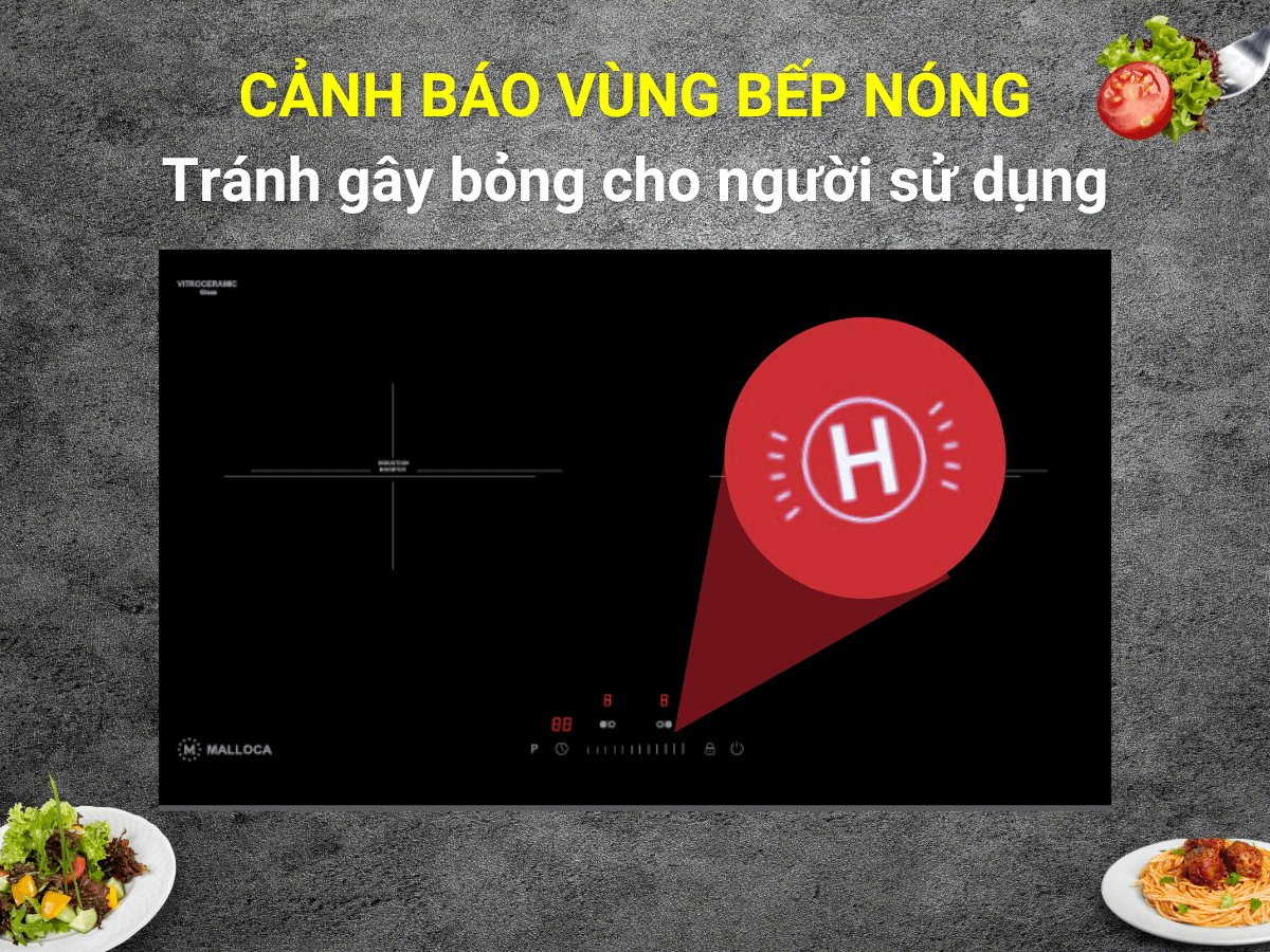 Bếp từ Malloca MH-732 IN đi kèm với tính năng cảnh báo vùng bếp nóng, giúp cảnh báo bạn khi vùng nấu trên bếp từ vẫn còn nhiệt cao sau khi nấu. Bằng cách hiển thị chữ “H” trên khu vực bảng điều khiển khi nhiệt độ nóng trên 60 độ C, người dùng sẽ cẩn trọng tránh chạm tay vào gây bỏng.