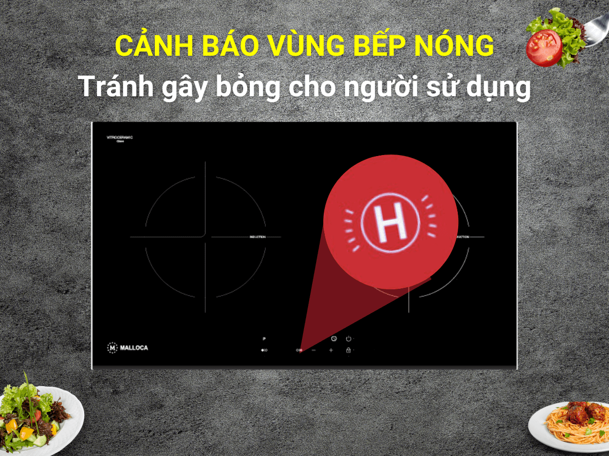 Bếp từ Malloca MH-7320 I được trang bị tính năng cảnh báo vùng bếp nóng để cung cấp thêm một lớp bảo vệ và giảm nguy cơ bỏng đối với người sử dụng. Khi nấu xong và vùng nấu vẫn còn nhiệt độ cao trên 60 độ C, màn hình sẽ hiển thị chữ “H” để bạn cẩn trọng tránh chạm tay vào gây bỏng.