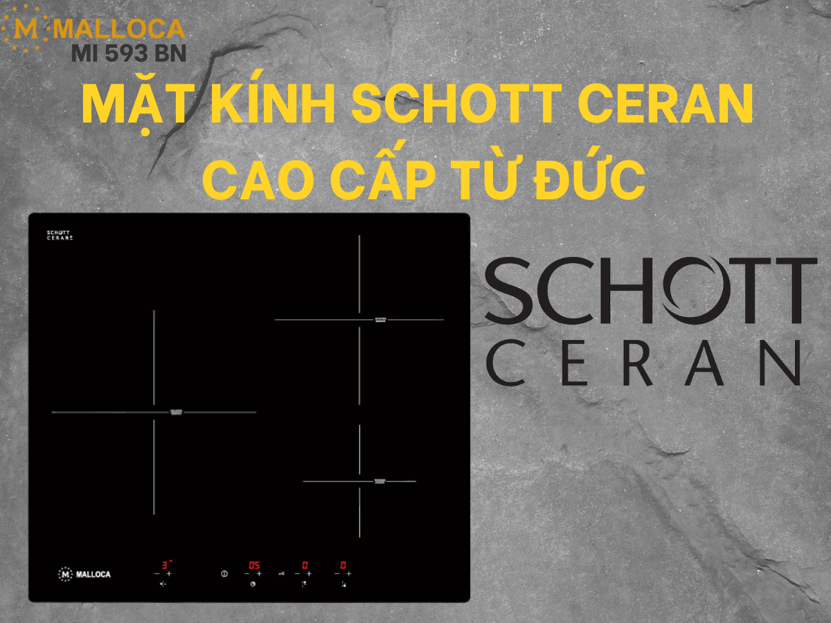 Bếp từ Malloca MI 593 BN sử dụng mặt kính Schott Ceran xuất xứ từ Đức. Chất liệu mặt kính này nổi tiếng là có độ bền cao, khả năng chịu lực và chịu sốc nhiệt cực tốt. Thiết kế mặt kính mang tính thẩm mỹ cao. Hơn nữa, loại kính này còn hạn chế bám bẩn, trầy xước và chịu được lực tốt.