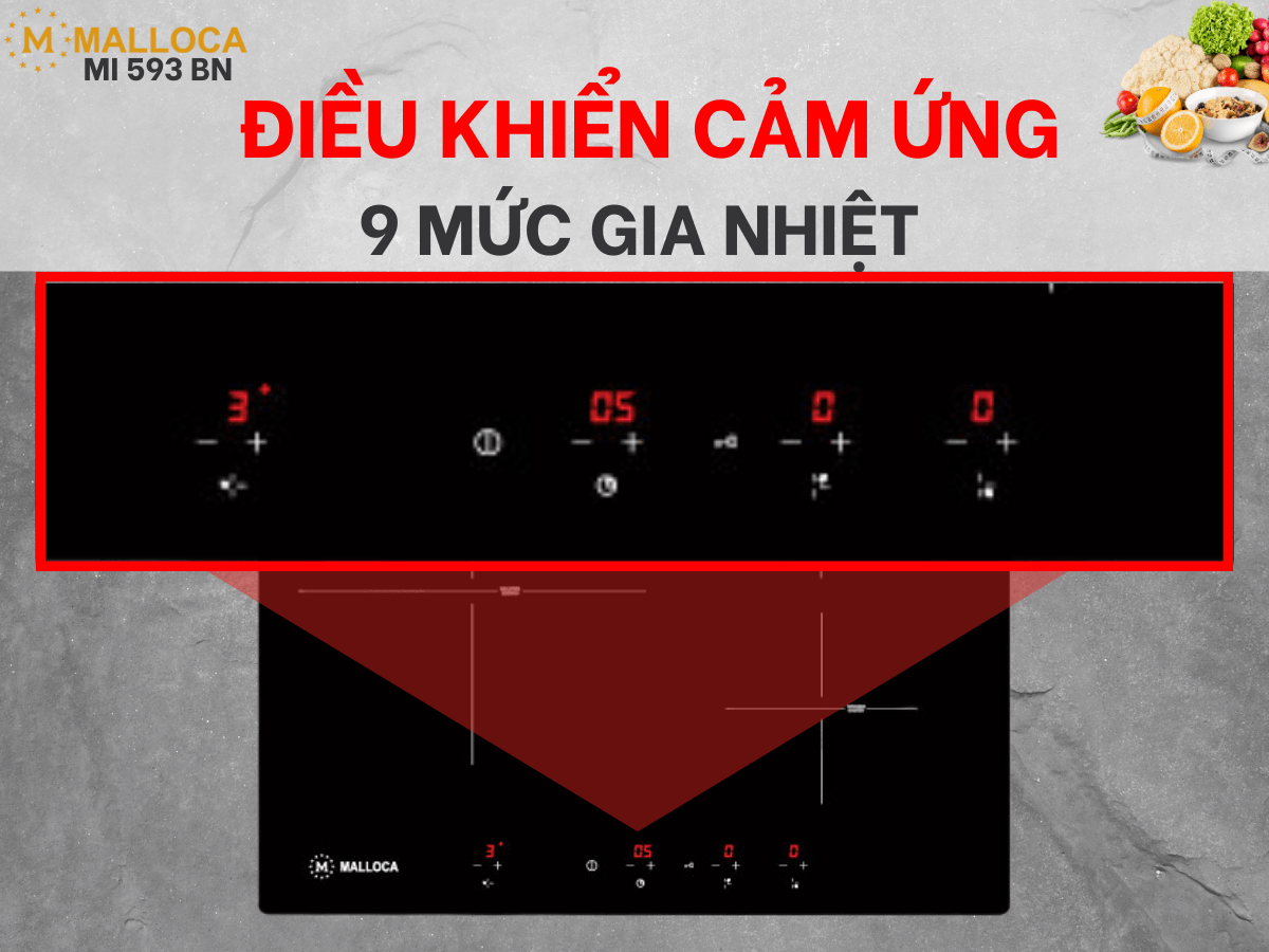 Bếp từ Malloca MI 593 BN được trang bị 9 mức cài đặt nhiệt đáp ứng được mọi nhu cầu nấu ăn của người dùng. Mức gia nhiệt từ 1 đến 9 giúp bạn có thể đa dạng nấu nhiều món như hấp, xào, luộc, hầm, chiên.. với mức nhiệt độ chính xác nhất cho từng món ăn, từng cách chế biến khác nhau.