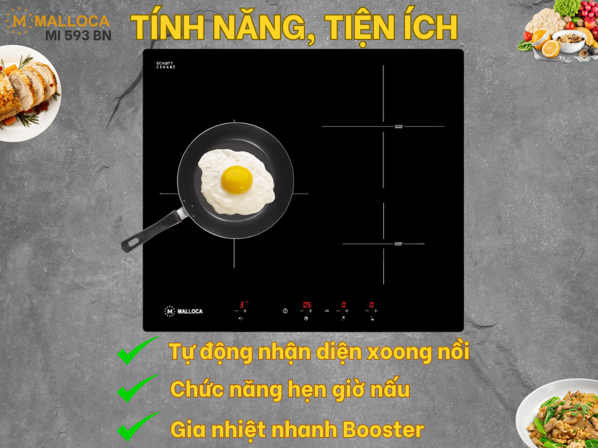 Bếp từ Malloca MI 593 BN thiết kế sang trọng, vùng nấu linh hoạt