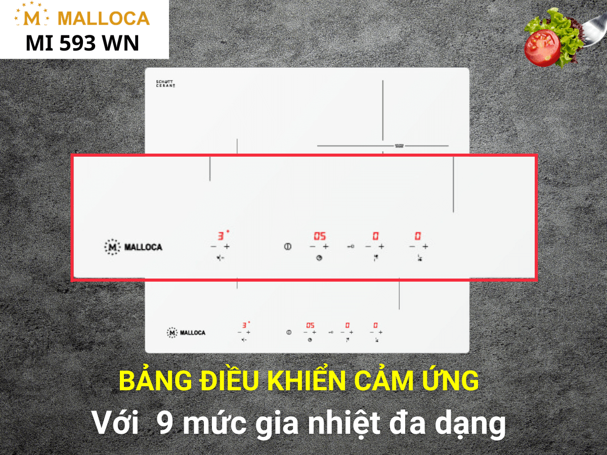 Bếp từ Malloca MI 593 WN được trang bị 9 mức cài đặt nhiệt đáp ứng được mọi nhu cầu nấu ăn của người dùng. Mức gia nhiệt từ 1 đến 9 giúp bạn có thể đa dạng nấu nhiều món như hấp, xào, luộc, hầm, chiên.. với mức nhiệt độ chính xác nhất cho từng món ăn, từng cách chế biến khác nhau.