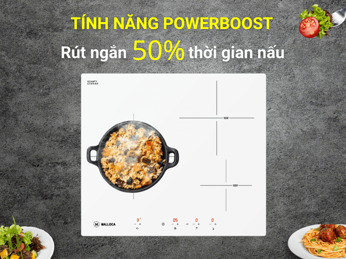 Nếu bạn muốn nấu nhanh và tiết kiệm thời gian thì tính năng gia nhiệt nhanh Booster sẽ là trợ thủ đắc lực nhất. Khi chức năng được khởi động, vùng nấu được chọn sẽ đạt công suất tối đa trong thời gian ngắn nhất, nấu nhanh gấp 3 lần so với bình thường. Rất hữu ích khi cần nấu nhanh, đun nước hoặc nấu những món đòi hỏi nhiệt độ cao.