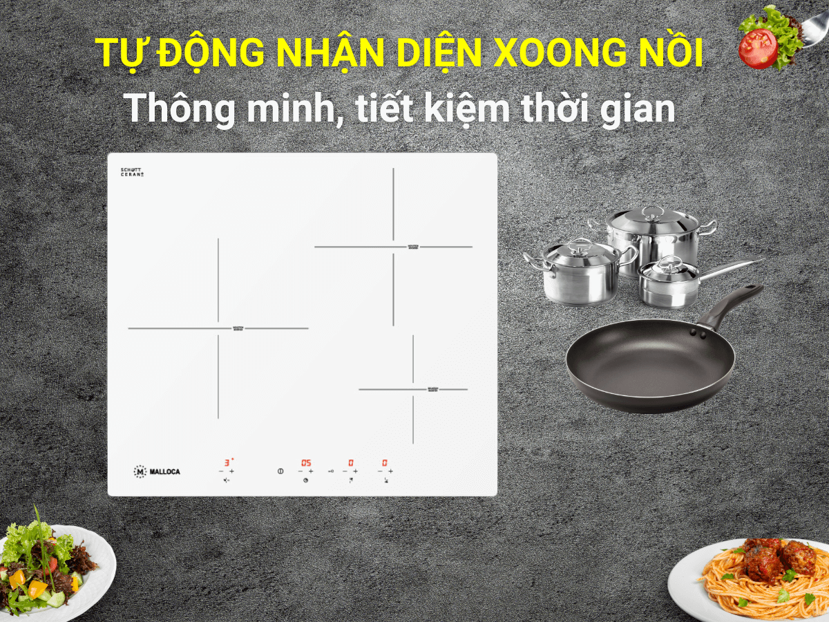 Với chức năng tự động nhận diện xoong nồi, khi đặt xoong nồi trên bếp, bếp từ Malloca MI 593 WN sẽ tự xác định xoong nồi một cách chuẩn xác và phân bổ đều nhiệt lên đáy nồi. Nhờ đó nhiệt lượng không bị toả ra ngoài giúp tiết kiệm điện và thức ăn được chín đều hơn, nhanh hơn, tiết kiệm thời gian cho người dùng.