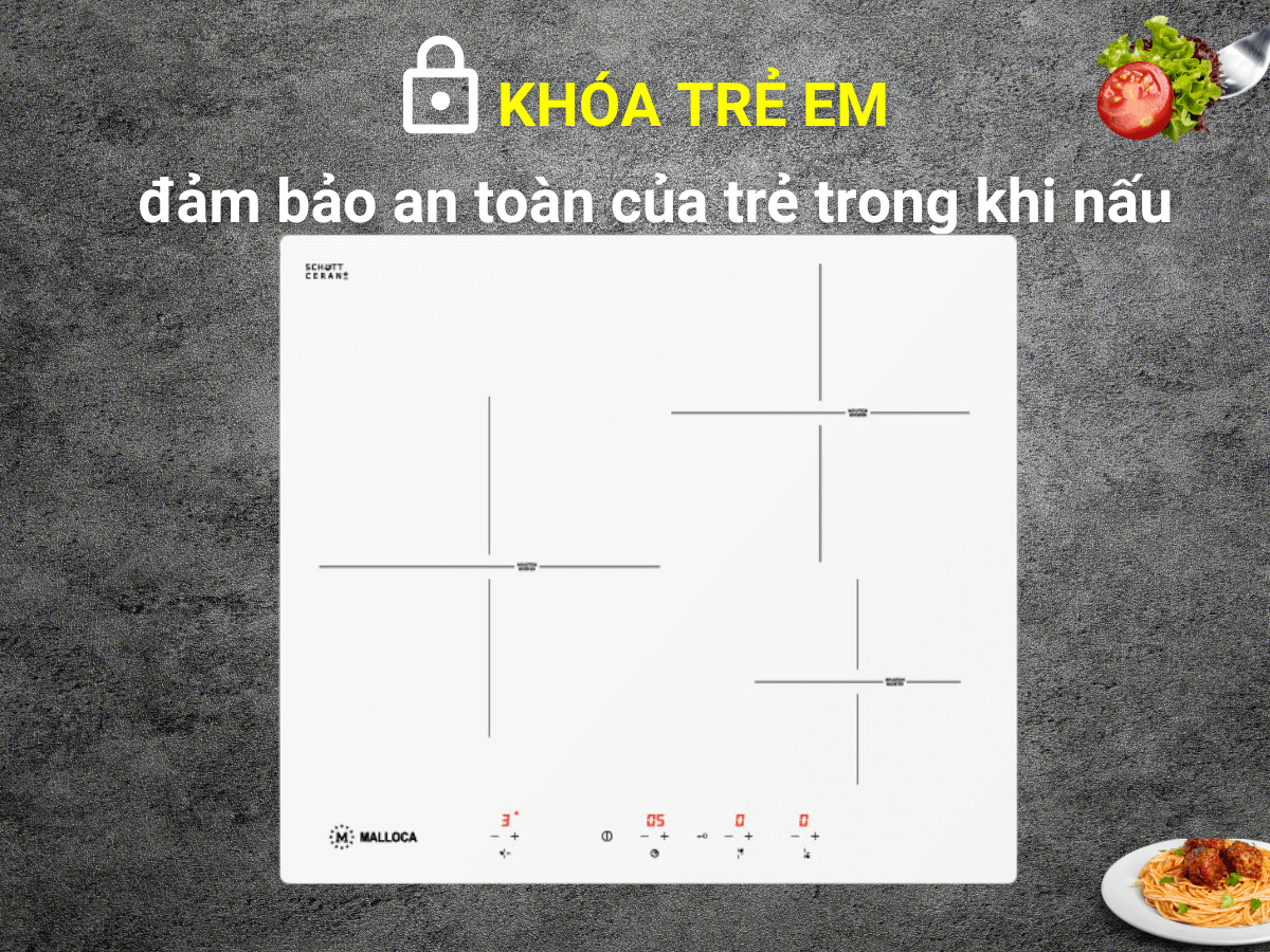 Khi bạn kích hoạt tính năng này, bếp từ Malloca MI 593 WN sẽ vô hiệu hóa bảng điều khiển nhưng không làm ảnh hưởng tới chương trình nấu nướng mà bạn đã cài đặt trước đó. Với những gia đình có trẻ nhỏ thì bạn không cần lo lắng khi đang nấu mà trẻ vô tình điều khiển bếp làm ảnh hưởng đến quá trình nấu cũng như gây nguy hiểm.