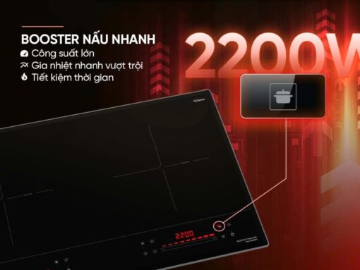 Đặc biệt là mỗi vùng nấu được trang bị chức năng Booster gia nhiệt nhanh, khi kích hoạt sẽ nâng mức công suất vùng nấu lên mức cực đại là 2200W, giúp nấu nhanh hơn, tiết kiệm thời gian.