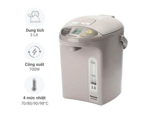 Bình thủy điện Panasonic NC-BG3000CSY với chức năng đun sôi nước và giữ nóng 4 mức nhiệt 70 – 80 – 90 – 98°C, cùng dung tích lớn 3 lít, đáp ứng tốt nhu cầu sử dụng nước nóng cho cả gia đình. Đặc biệt bình còn có chức năng hẹn giờ, đun sôi lại, khoá vòi nước… mang đến nhiều trải nghiệm tiện lợi và an toàn.