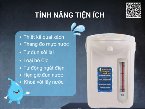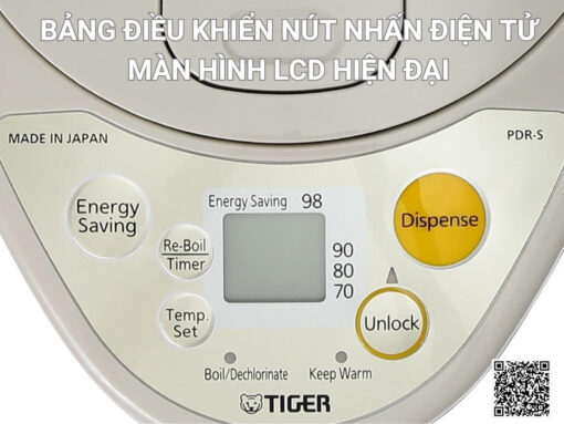 Bình thủy điện Tiger PDR-S30W với chức năng đun sôi nước 100°C và giữ ấm 4 mức nhiệt 70 – 80 – 90 – 98°C, cùng dung tích 3 lít, đáp ứng tốt nhu cầu sử dụng nước nóng cho cả gia đình. Hệ thống bảng điều khiển nút nhấn điện tử và màn hình hiển thị LCD hiện đại, dễ sử dụng. Đặc biệt bình còn có chức năng tự đun sôi lại khi nước nguội, khử mùi clo trong nước, chế độ tiết kiệm điện, hẹn giờ đun nước, tự động khóa vòi khi không sử dụng, tự động ngắt điện khi hết nước, nghiêng đổ bình… mang đến nhiều trải nghiệm tiện lợi và an toàn.