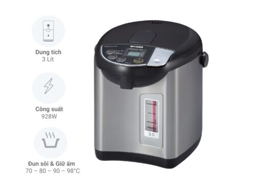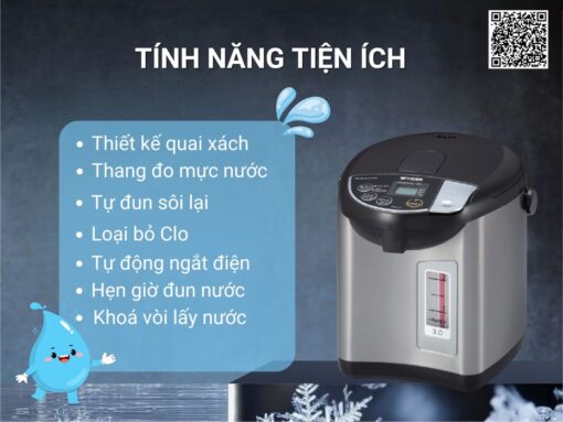 Bình thủy điện Tiger PDU-A30W với chức năng đun sôi nước 100°C và giữ ấm 4 mức nhiệt 70 – 80 – 90 – 98°C, cùng dung tích lớn 3 lít, đáp ứng tốt nhu cầu sử dụng nước nóng cho cả gia đình. Hệ thống bảng điều khiển nút nhấn điện tử và màn hình hiển thị LCD hiện đại, dễ sử dụng. Đặc biệt bình còn có chức năng tự đun sôi lại khi nước nguội, khử mùi clo trong nước, chế độ tiết kiệm điện, hẹn giờ đun nước, tự động khóa vòi khi không sử dụng, tự động ngắt điện khi hết nước, nghiêng đổ bình… mang đến nhiều trải nghiệm tiện lợi và an toàn.