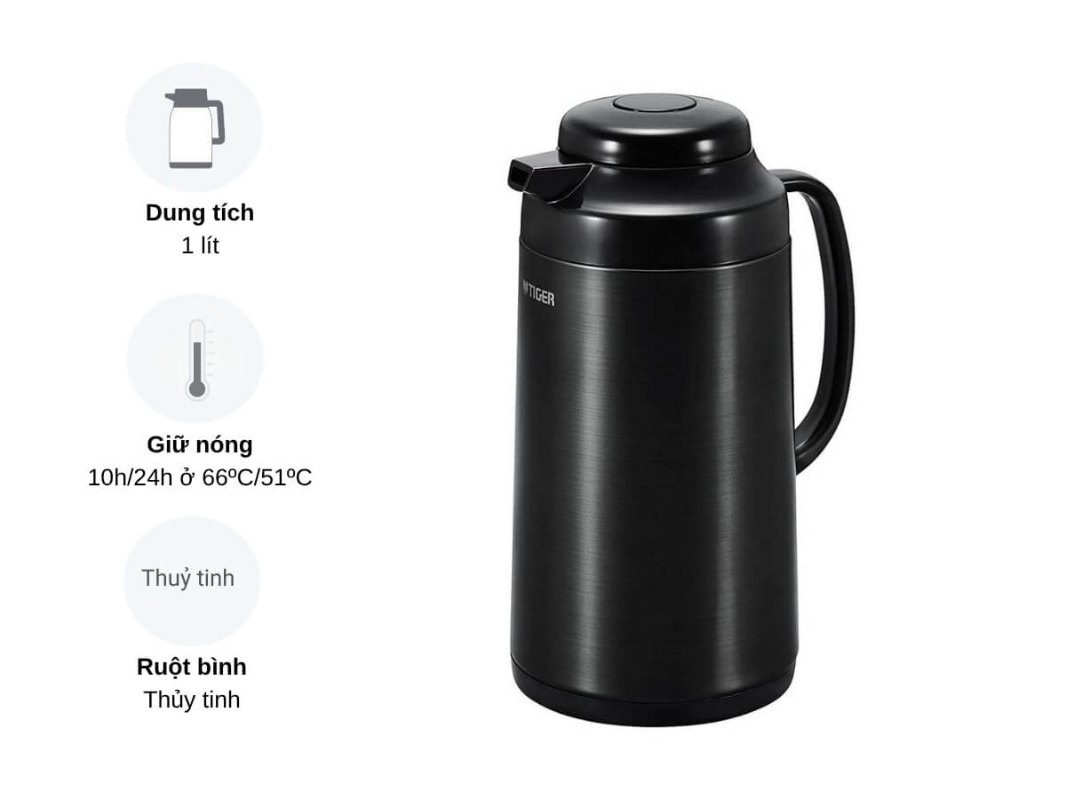 Bình thủy Tiger PRO-COO có dung tích 1 lít vừa phải, phù hợp cho nhu cầu sử dụng hằng ngày tại gia đình hoặc văn phòng. Sản phẩm được trang bị ruột thủy tinh cách nhiệt giữ nhiệt hiệu quả, giúp nước nóng hoặc lạnh được duy trì lâu hơn. Thiết kế tiện dụng với nút nhấn đóng mở nhẹ nhàng, mang đến trải nghiệm sử dụng thoải mái và an toàn.