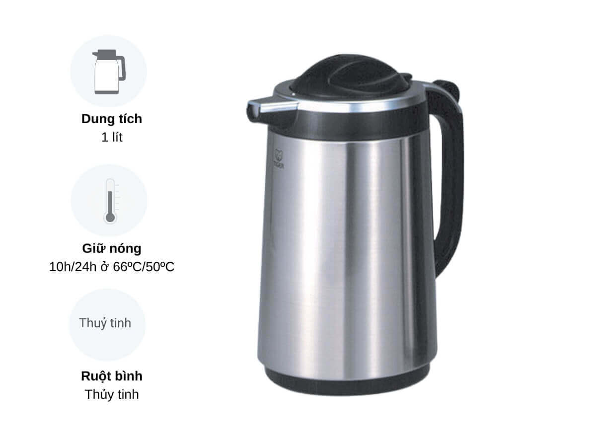 Ruột bình được làm từ thủy tinh chịu nhiệt cao cấp, không sinh chất độc hại khi tiếp xúc với nước nóng, đảm bảo an toàn tuyệt đối cho người dùng. Lớp vỏ ngoài bằng thép không gỉ sơn tĩnh điện sáng bóng, bền màu và dễ vệ sinh. Nhờ cấu tạo hai lớp cách nhiệt, bình có thể giữ nước nóng ở nhiệt độ cao trong nhiều giờ liền, tiết kiệm thời gian đun nước nhiều lần trong ngày.