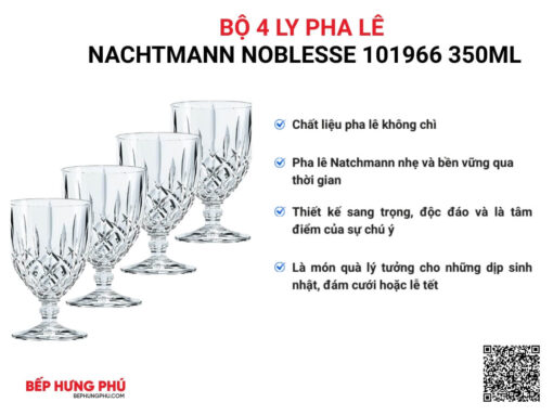 Bộ 4 ly pha lê Nachtmann Noblesse 101966 350ml sở hữu thiết kế tinh xảo, kiểu dáng sang trọng, sẽ tăng thêm thẩm mỹ cho bàn tiệc của bạn. Bộ ly được làm từ thủy tinh pha lê cao cấp, không chứa tạp chất, an toàn sức khoẻ, dễ vệ sinh và đảm bảo vẻ sáng bóng bền lâu. Đặc biệt là khả năng chịu lực, chịu nhiệt cực tốt, có thể dùng an toàn trong máy rửa chén.