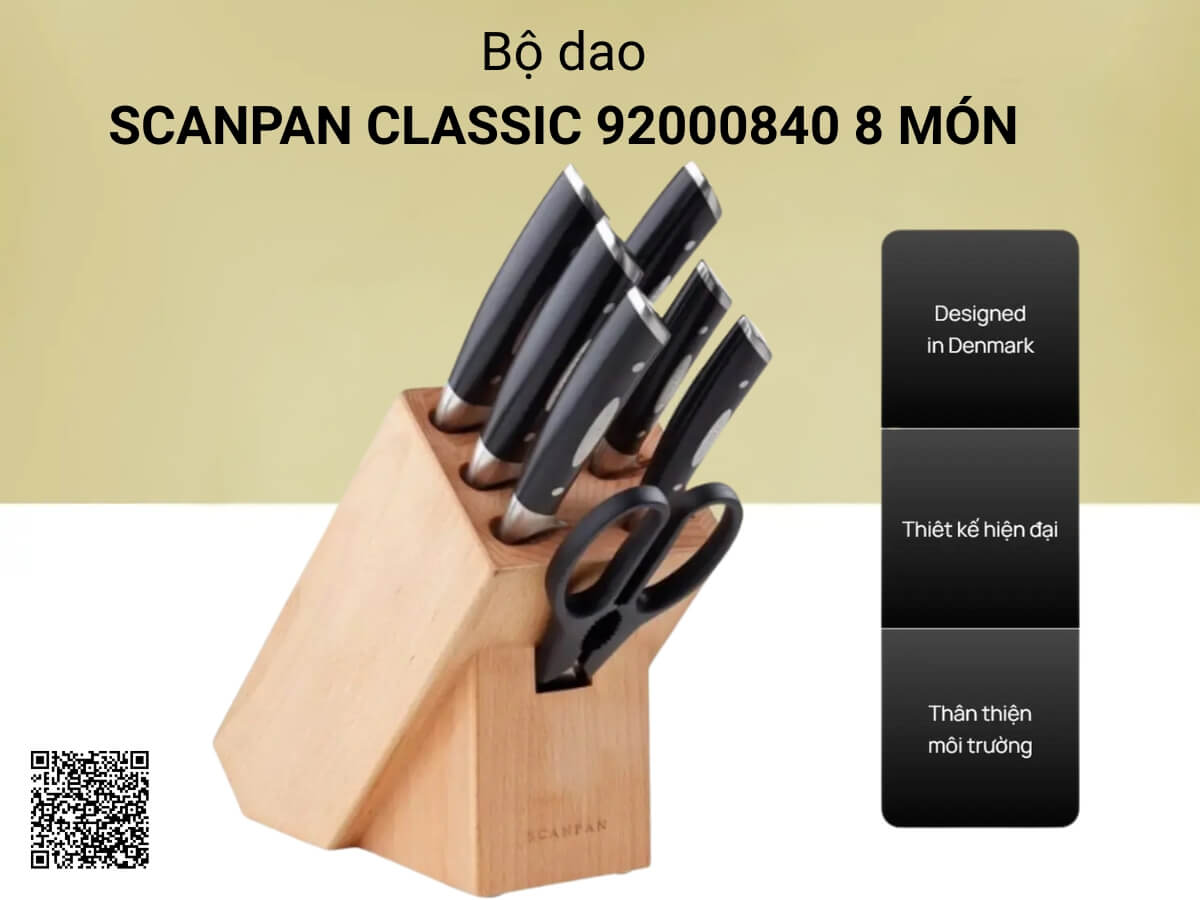 Bộ dao Scanpan Classic 92000840 8 món gồm 1 dao thái gọt 9cm, 1 dao 14cm, 1 dao 15cm, 1 dao 20cm, 1 dao khắc 20cm, 1 dao bánh mỳ 20cm, 1 kéo bếp và 1 khối cắm dao gỗ dẻ gai, đáp ứng tốt mọi nhu cầu cắt gọt, sơ chế thực phẩm, phù hợp dùng cho căn bếp gia đình và cả những đầu bếp chuyên nghiệp. Bộ dao được làm từ thép chất lượng cao của Đức, có độ cứng chắc và sắc bén hoàn hảo (HRC 56), chống gỉ sét. Tay cầm thiết kế chuyên nghiệp, cầm nắm thoải mái, dễ dàng ngay cả khi ướt.