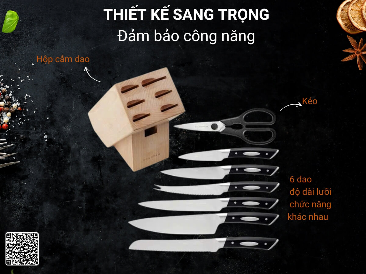 • Gồm 6 dao đa năng (9cm, 14cm, 15cm, 20cm, dao khắc 20cm, dao bánh mỳ 20cm), 1 kéo bếp1 khối cắm dao gỗ dẻ gai.
