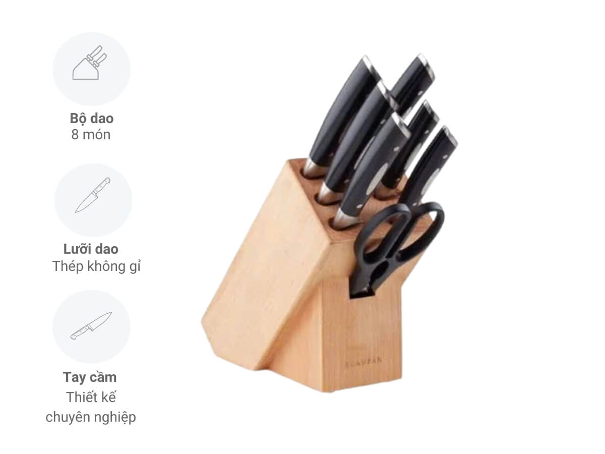 Loại daoBộ dao 8 món (gồm 6 dao, 1 kéo và 1 khối cắm)