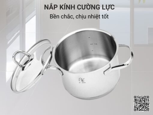 Bộ nồi Be-Home 5 món với phần nắp nồi được làm từ kính trong suốt, chắc chắn, chịu nhiệt tốt giúp dễ dàng quan sát thực phẩm khi đang nấu mà không cần mở nắp. Đặc biệt, bên trong lòng mỗi nồi đều có vạch đo mực nước, giúp người nội trợ thuận tiện trong việc định lượng nguyên liệu, món ăn một cách chính xác.
