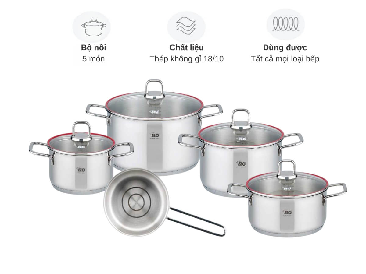 Bộ nồi inox Elo Excellent 5 món được làm từ inox 18/10 cao cấp, an toàn cho sức khỏe và bền bỉ theo thời gian. Thiết kế sang trọng với vành nắp viền đỏ, vạch chia dung tích tiện dụng và đáy 3 lớp truyền nhiệt nhanh, giúp nấu ăn hiệu quả, tiết kiệm năng lượng. Bộ nồi gồm 5 kích thước khác nhau, dùng được trên mọi loại bếp, kể cả bếp từ.
