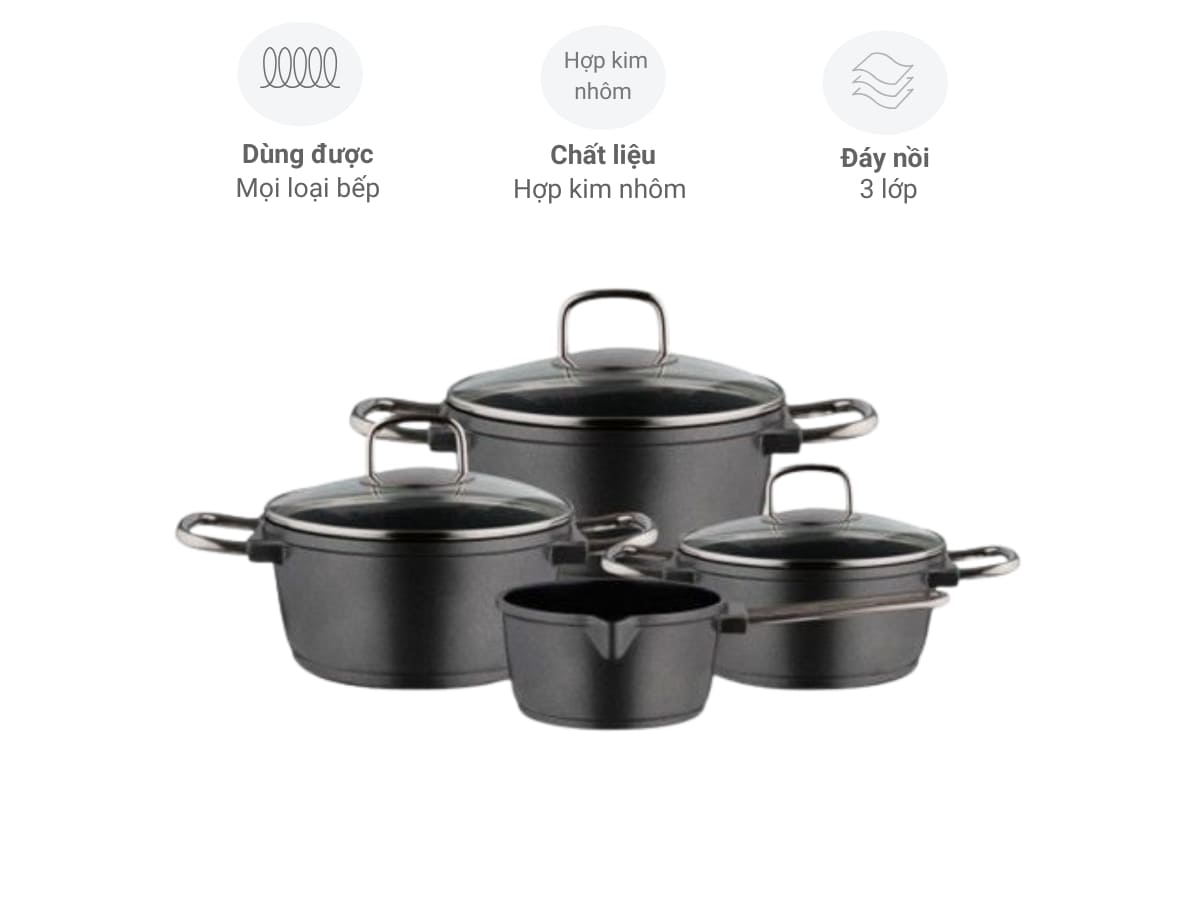 Bộ nồi Elo Pure Solution 4 món là giải pháp tuyệt vời cho căn bếp hiện đại, được nhập khẩu nguyên bộ từ CHLB Đức. Bộ sản phẩm bao gồm 4 món đa dụng: 1 quánh (Ø16cm), 1 nồi nhỏ (Ø16cm), 1 nồi vừa (Ø20cm) và 1 nồi to (Ø24cm). Bộ sản phẩm được làm từ chất liệu hợp kim nhôm cao cấp, sử dụng công nghệ hút chân không. Mặt trong được phủ lớp chống dính Thermoceramica an toàn, chịu nhiệt lên tới 400ºC, trong khi mặt ngoài phủ lớp silicol màu đen mang lại thẩm mỹ cao và khả năng chống xước tốt. Bộ nồi Elo Pure Solution 4 món giúp bảo lưu dinh dưỡng, tiết kiệm năng lượng và sử dụng được trên mọi loại bếp, kể cả bếp từ.