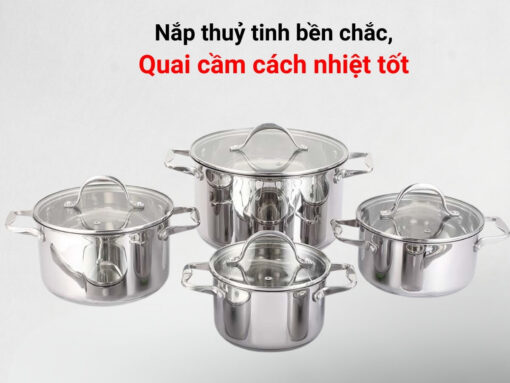 Bộ nồi Fandi Smart Ultra 4 món bao gồm 4 nồi với đường kính khác nhau, lần lượt Ø18/20/24cm, đáp ứng tốt nhu cầu nấu nướng hàng ngày của gia đình. Bộ nồi được làm từ chất liệu inox 304 an toàn, chống hoen gỉ, dễ vệ sinh. Cấu tạo đáy 5 lớp siêu bền, hiệu suất đun nấu cao và có thể dùng được trên mọi loại bếp: bếp từ, bếp gas, hồng ngoại…