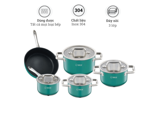 • Gồm 3 nồi 24/20/18cm, 1 quánh 16cm, 1 chảo 24cm