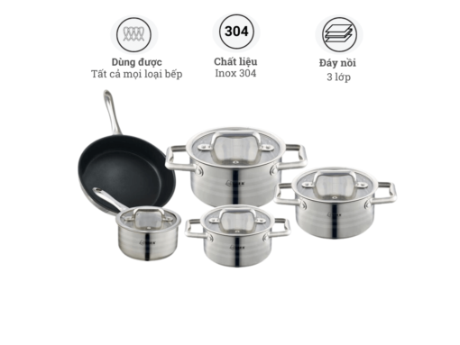 • Gồm 3 nồi 24/20/18cm, 1 quánh 16cm, 1 chảo 24cm