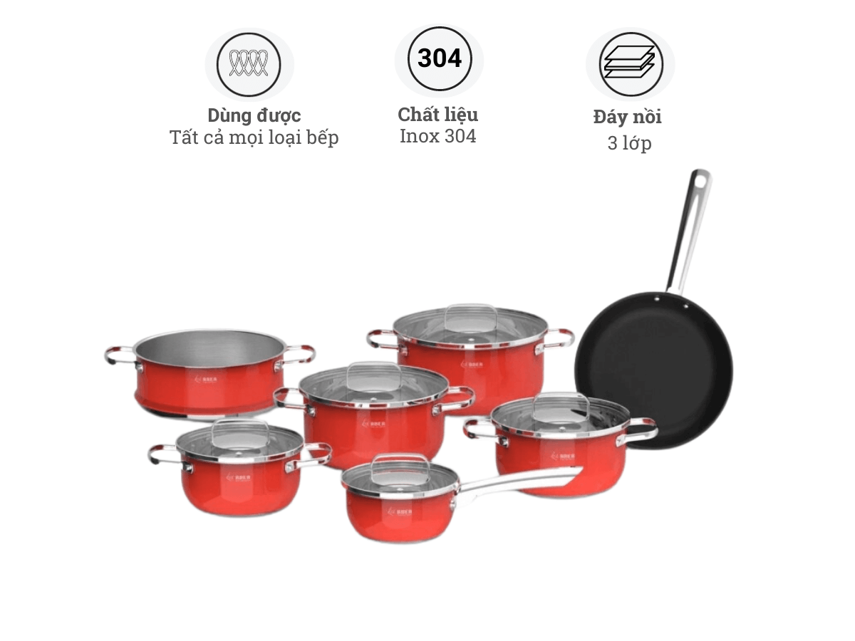 Bộ nồi inox Arber GARNET thiết kế sang trọng, đẹp mắt với màu đỏ tạo điểm nhấn thẩm mỹ trong không gian bếp. Bộ nồi 7 món bao gồm nồi, xửng hấp, chảo chiên, đáp ứng đầy đủ nhu cầu nấu nướng hàng ngày của gia đình. Chất liệu nồi inox sáng bóng, bền chắc, an toàn sức khoẻ, nấu ăn ngon, đặc biệt là có thể dùng với mọi loại bếp, kể cả bếp từ.