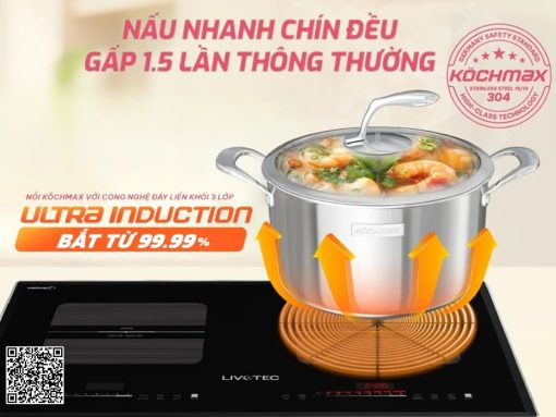 Công nghệ Ultra Induction độc quyền từ Kochmax giúp tối ưu khả năng hấp thụ năng lượng từ bếp, cho hiệu suất nấu vượt trội. Nhờ đó, món ăn chín nhanh hơn đến 1.5 lần so với nồi thường – vừa tiết kiệm thời gian, điện năng, vừa giữ nguyên hương vị và giá trị dinh dưỡng của từng món ăn.